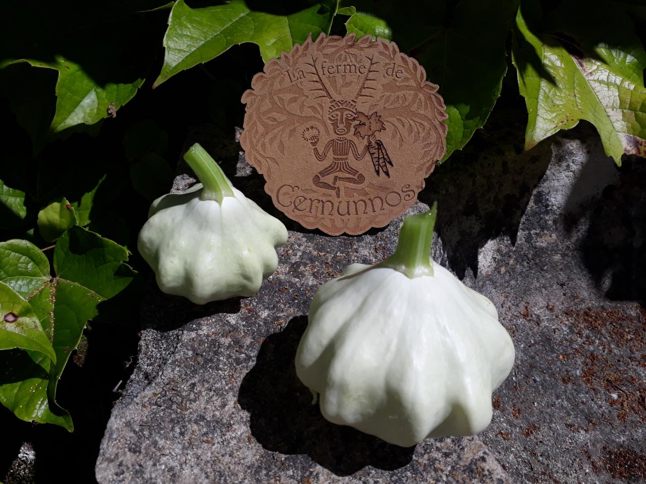 Pâtissons blancs cultivés en Agriculture Biologique à Serley (71) et cueillis avant maturité : tendres, ils peuvent se manger sans être épluchés, râpés en crudités ou farcis et cuits.