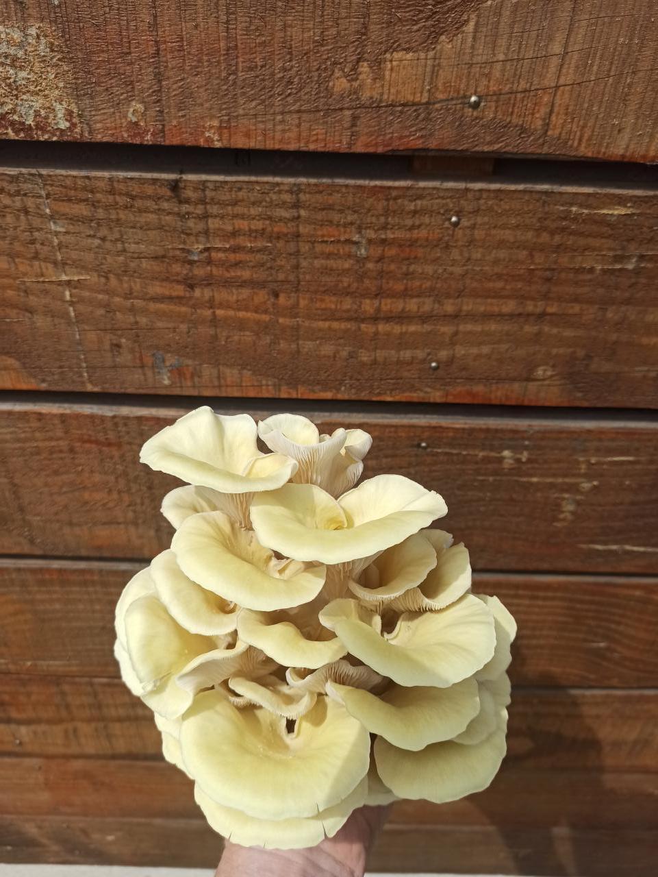 Champignons produit de manière artisanale grâce à un mélange de sciures de bois, de son de blé et de seigle produit a moins de 50km.