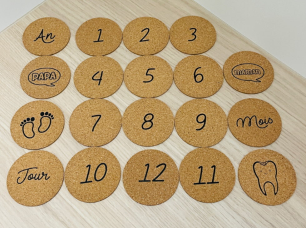 4 ronds avec premier mots papa, maman, première dent et premier pas.