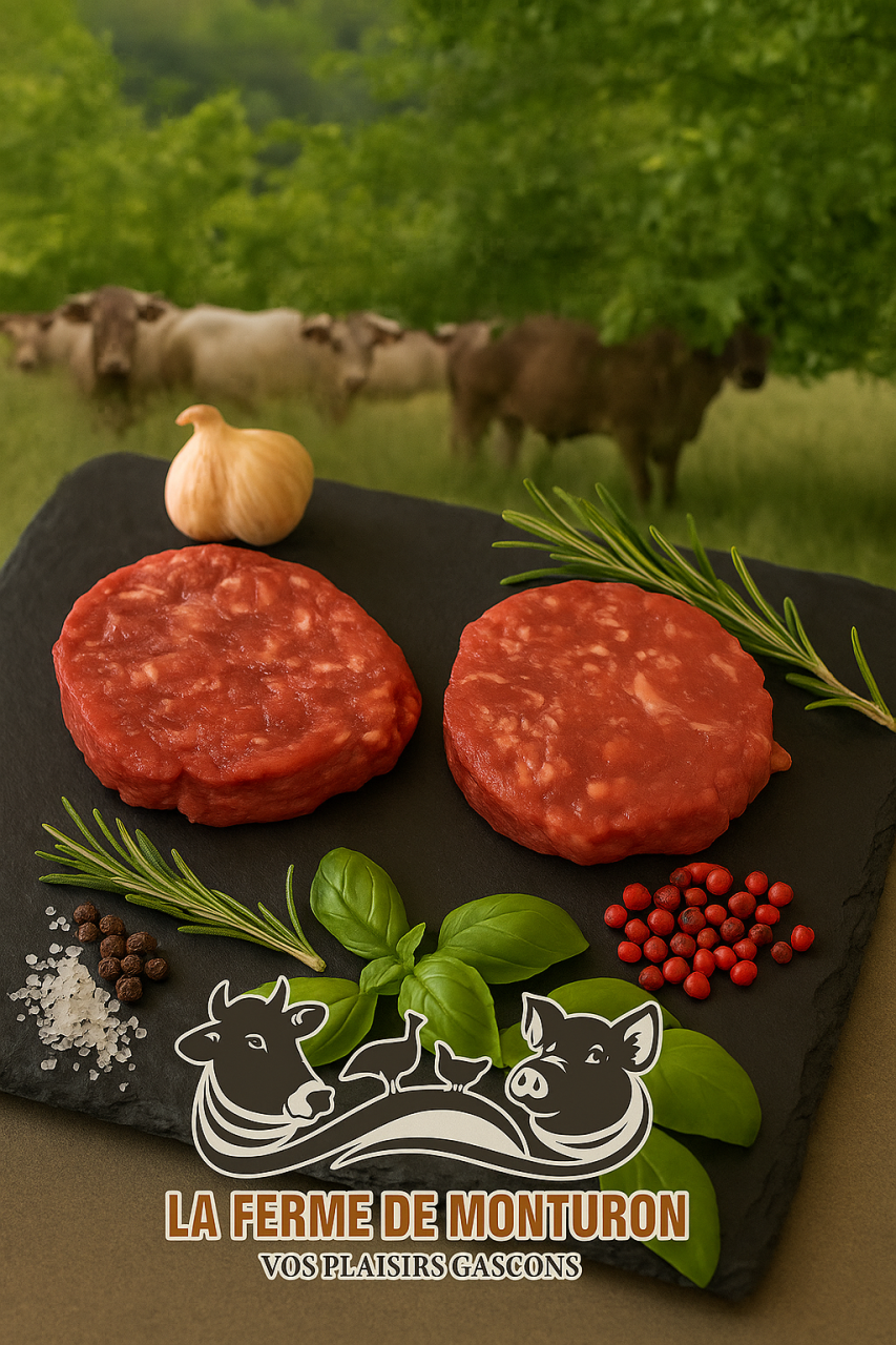 Steaks hachés de boeuf Bazadais élevé et nourri sur la ferme. Par lot de 8 steaks hachés sous vide