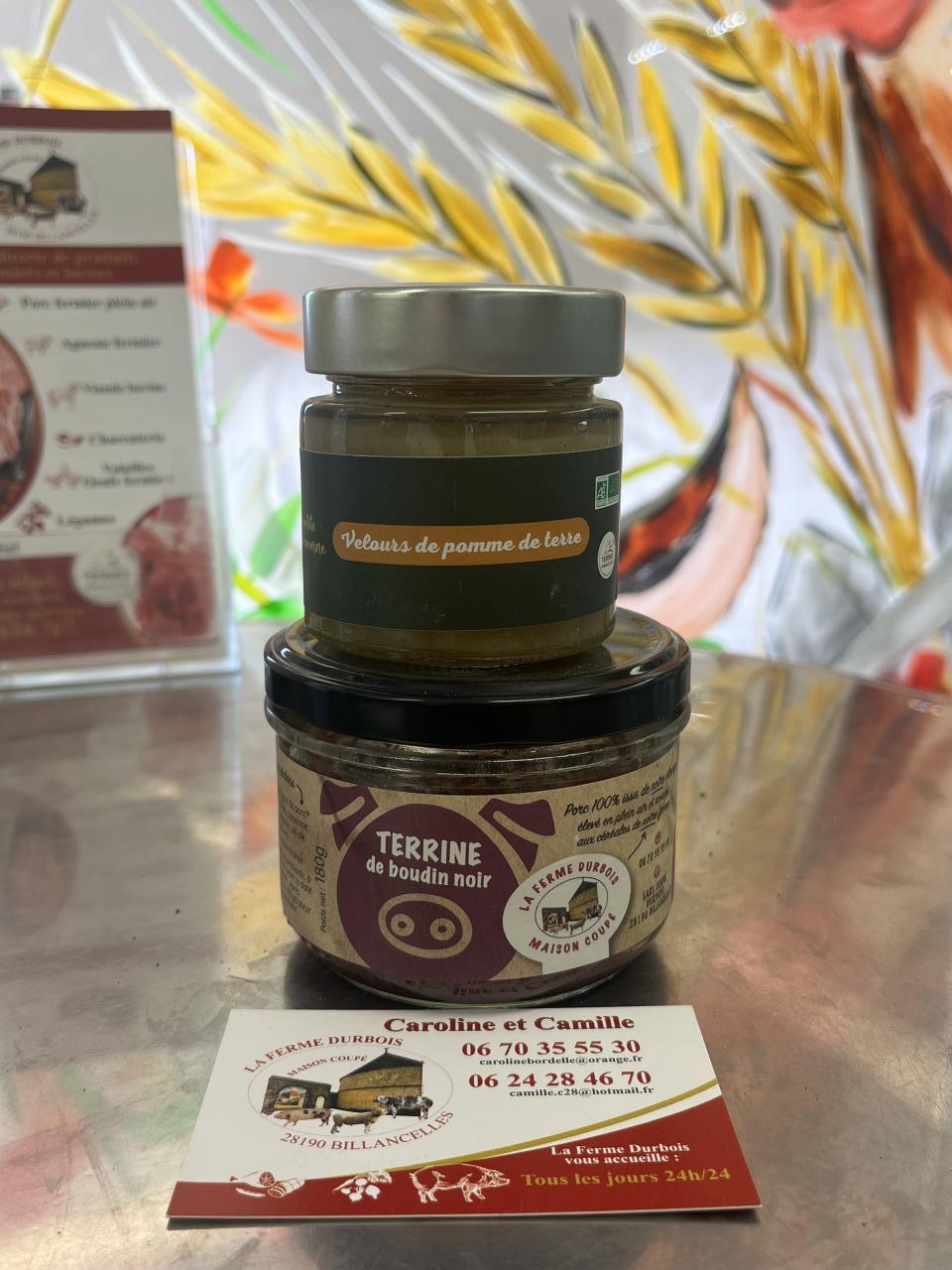 Terrine de boudin noir , issu de notre élevage de porcs fermiers plein air à LA FERME DURBOIS ( 28). Conditionné en 180 gr dans un bocal en verre