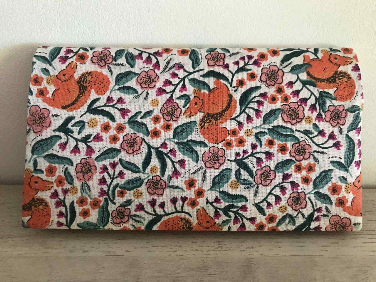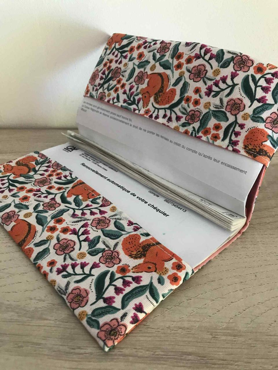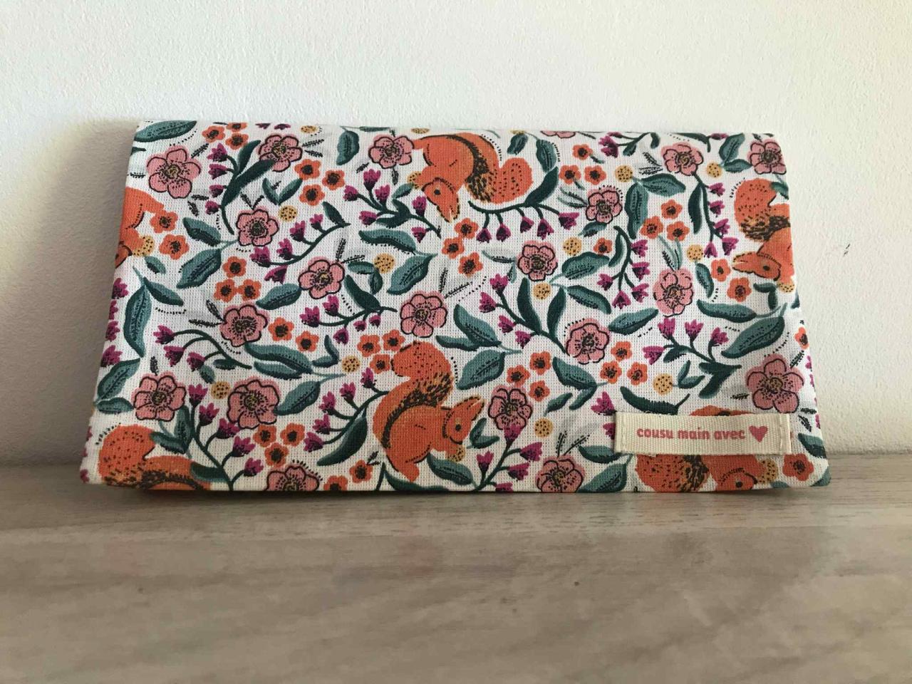 Porte chéquier réalisé en tissu 100% coton imprimé "écureuils", il est entièrement doublé de tissu 100% coton uni rose.
