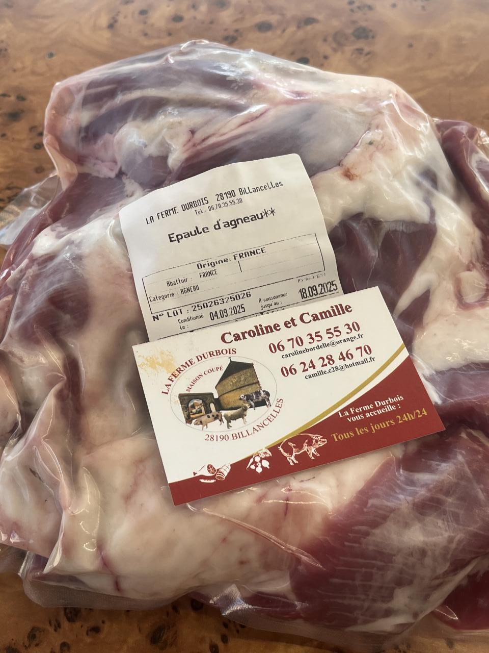 Epaule d'agneau , issu de notre élevage plein air d'agneaux de la FERME DURBOIS. Tous les agneaux sont nés et élevés sur place grâce à nos 75 brebis de race sulfolk pendant plus de 5 mois. Poids approximatif : 2kg ( non contractuel) Photo non contractuelle