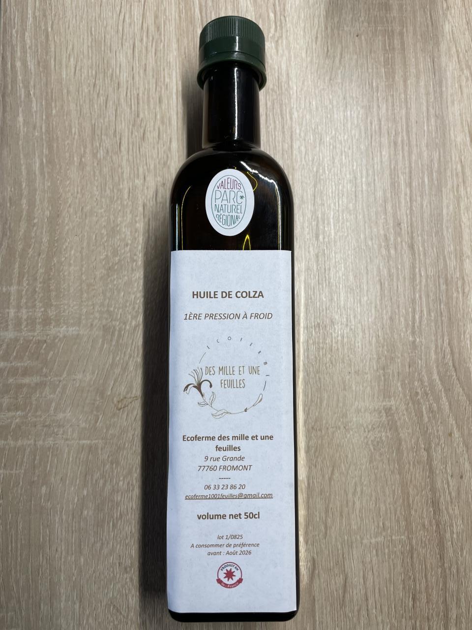 Conditionnement : bouteille verre fumé pour une meilleure conservation et bouchon fraîcheur avec orifice verseur Durée de conservation : 6 mois Ingrédients : colza Origine : Ecoferme des milles et une feuilles - 77760 FROMONT
