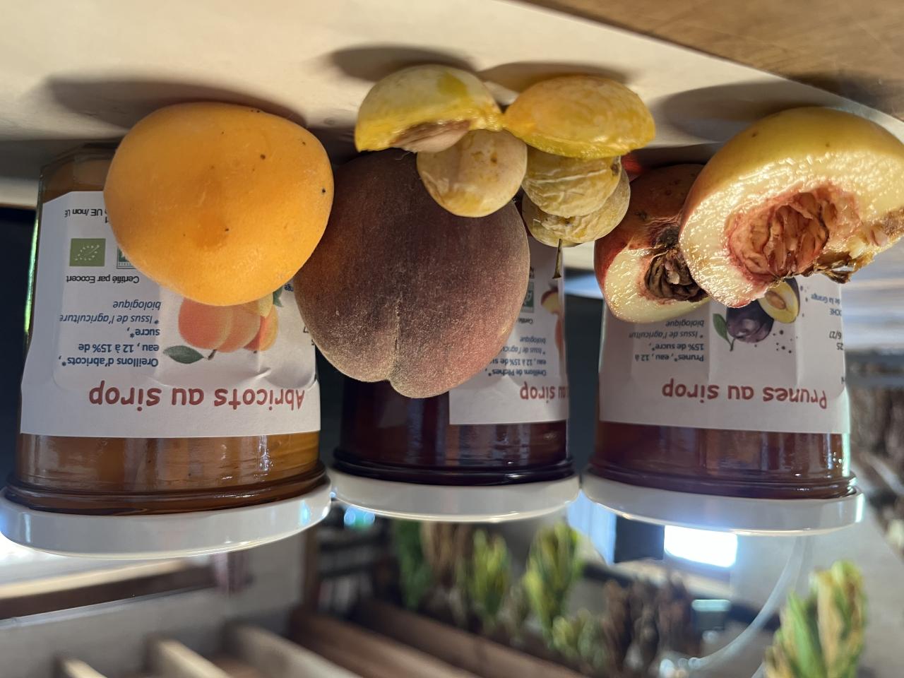 Pêches de nos champs bio, un peu de sucre (12à 15%) de canne bio et de l'eau.