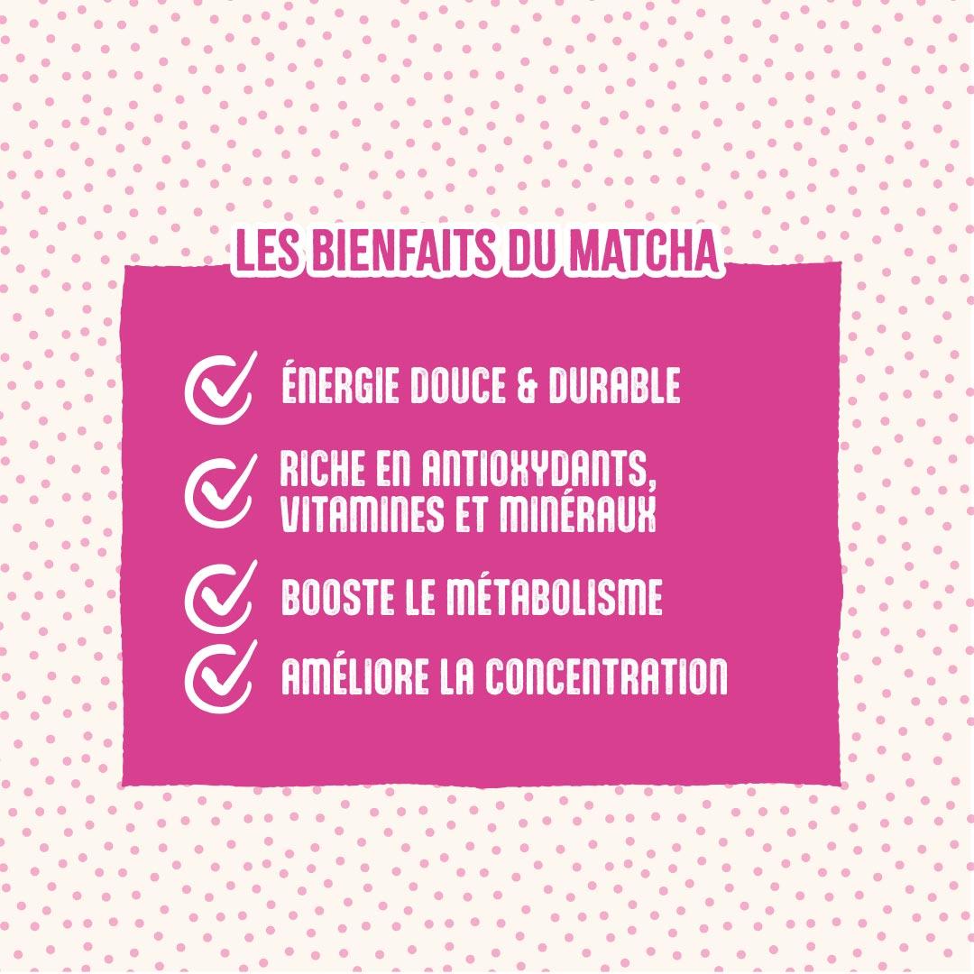 Contrairement au thé vert classique, le matcha n’est pas infusé mais entièrement consommé : on mélange la poudre de thé matcha avec un liquide chaud, ce qui donne une boisson riche en antioxydants, en caféine naturelle et en L-théanine, une substance qui favorise la concentration et la détente.
