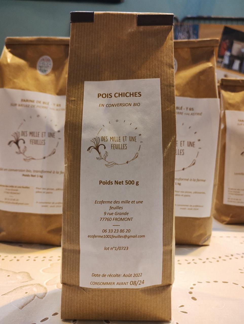 Conditionnement : sachet kraft de 500g avec fenêtre et barrette de fermeture Durée de conservation : 1 an Ingrédients : POIS CHICHE Origine : Scoffeme des milles et une feuilles - 77760 FROMONT - FRANCE
