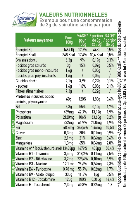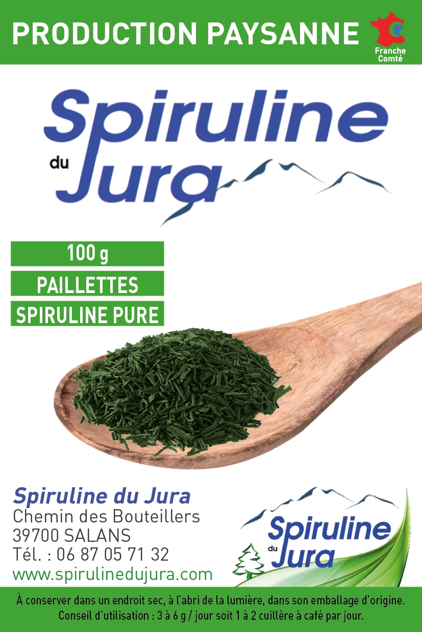 Allergènes : Aucun Conditionnement : Sachet longue conservation et refermable Durée de conservation : 2 ans Ingrédients : Spiruline BIO Origine : Salans (39) Jura