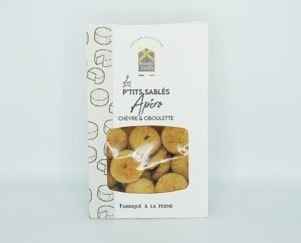 Ces biscuits salés sont fabriqués à la ferme avec notre farine de blé, nos œufs frais et notre huile de tournesol, relevés de fromage de chèvre local et de ciboulette pour une alliance gourmande et pleine de personnalité.