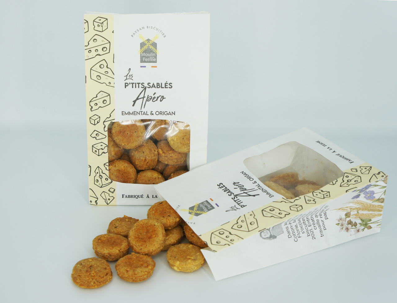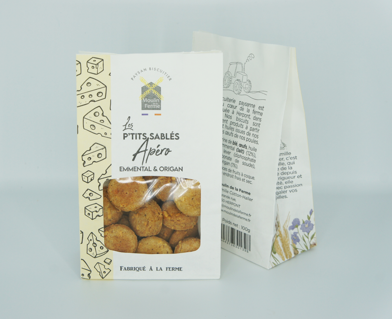 Élaborés à la ferme avec notre farine de blé, nos œufs frais et notre huile de tournesol, ces biscuits salés marient la douceur fondante de l’emmental à la fraîcheur parfumée de l’origan.