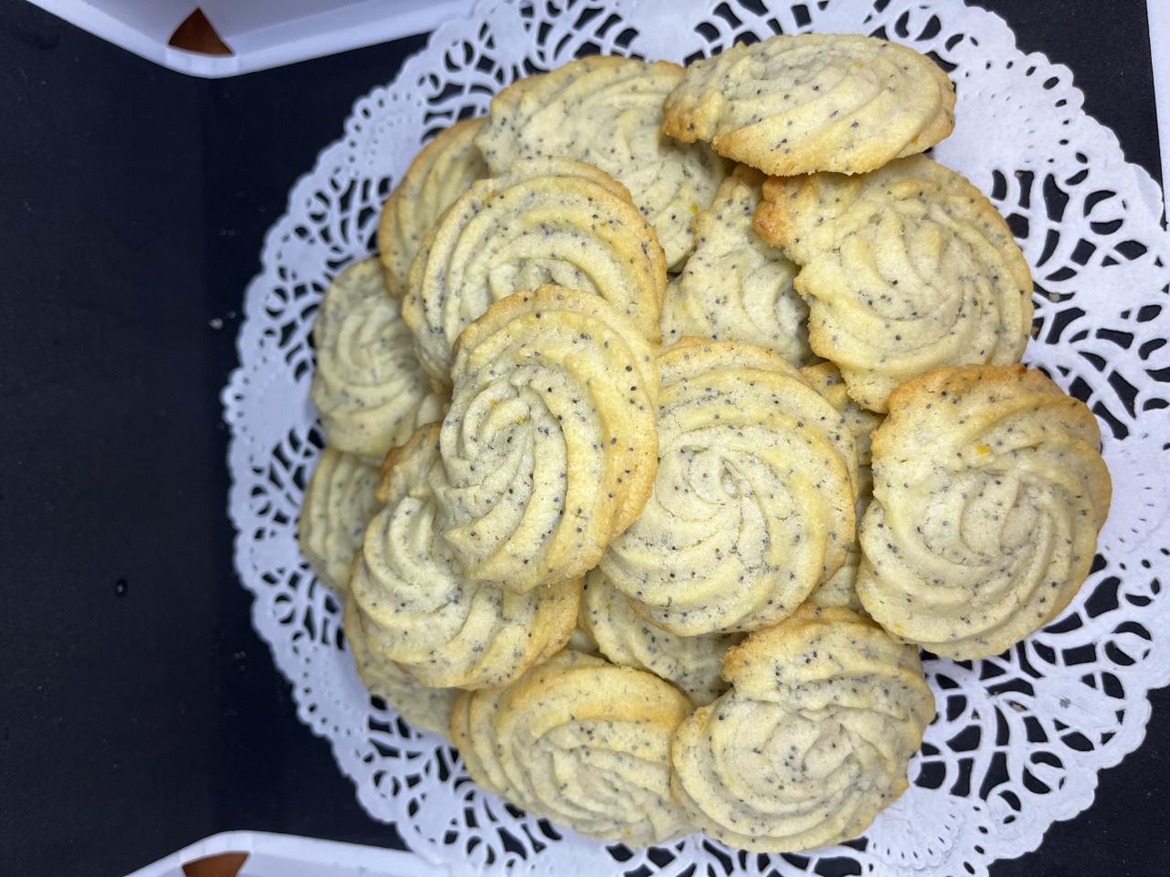 Petits sablés au citron avec des graines de pavots. Ce biscuit allie le fondant du gâteau et le croquant du pavot avec l’acidité du citron, c’est un savoureux délice (pour les adeptes du cake citron/pavot vous retrouverez les mêmes saveurs) vendu au poids. Ils peuvent être mangés avec une boisson après un repas ou au goûter. Mais aussi juste par gourmandise car il n’y a pas de moment spécial pour se laisser tenter par cette gourmandise. Vendu au poids