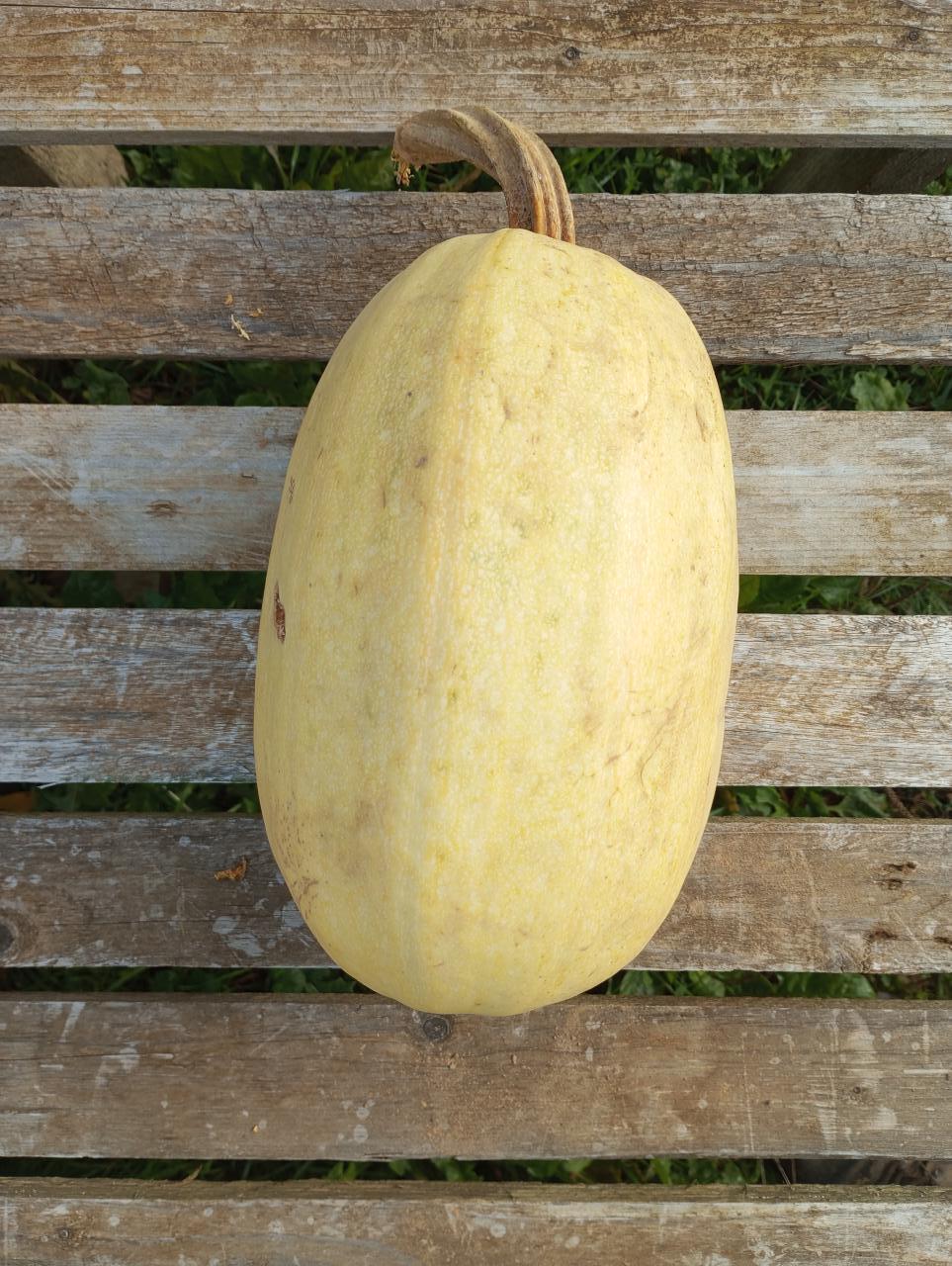 La courge Spaghetti est un fruit ovoïdes de 20 à 30 cm de long de 2 à 4 kg. La chair donne à la cuisson de longs filaments fermes et peu parfumés comme les pâtes italiennes qui portent le même nom.