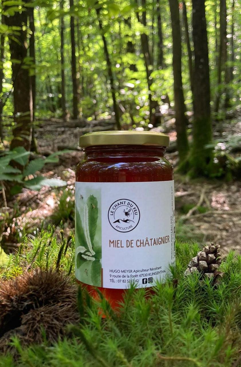 Miel de châtaignier produit à Klingenthal/Boersch/Ottrott. Ce miel est récolté en Juillet, juste après la récolte du miel de forêt et avant mes petites "transhumances", qui mènent mes colonies en montagne, dans les sapinières !