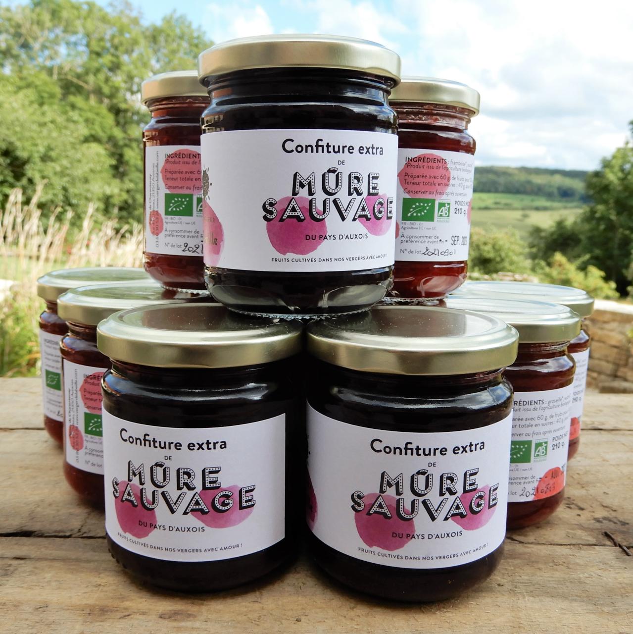 Mûres de l'Auxois saveurs et parfum garantis récolté et transformé à la ferme. Cette confiture est élaborée avec des mûres sauvages cueillies à la main autour du verger et du sucre bio. Sa saveur inimitable accompagnera délicieusement tartines, yaourts, fromages blancs et desserts. Nous avons soigneusement épépiné la mûre pour donner une structure fine à cette confiture, elle vous rappellera les saveurs douces et naturelles de la mûre et accompagnera délicieusement tartines, yaourts, fromages blancs, desserts de Noël et petites gourmandises.