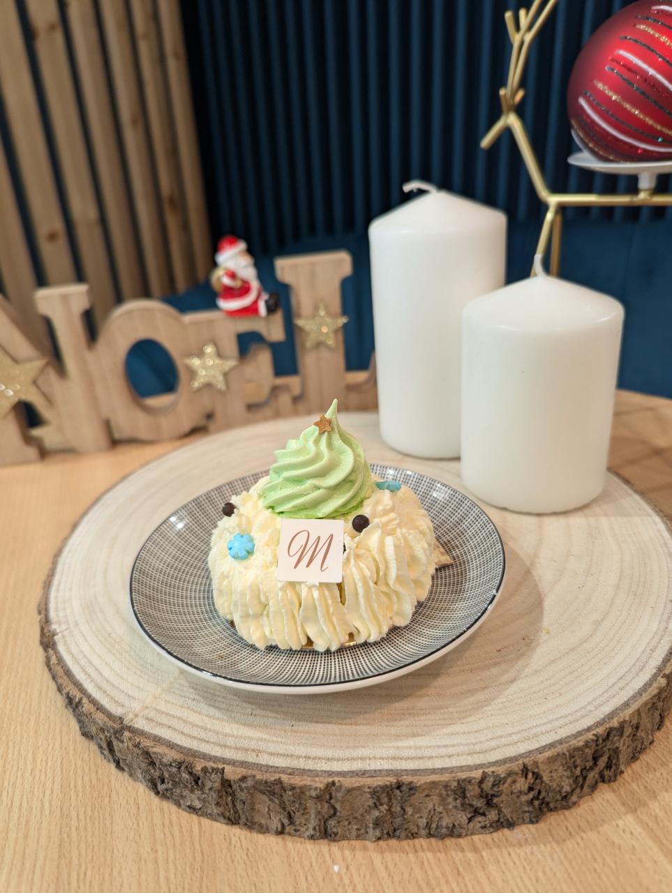 Notre forêt blanche est composé de génoise crème vanille chantilly et d'une meringue verte en forme de sapin