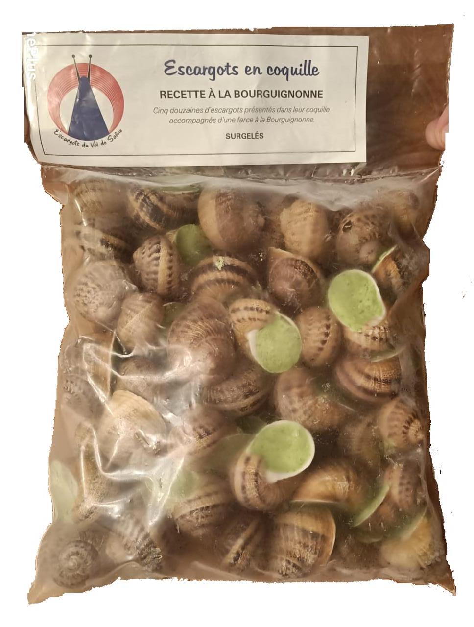 5 douzaines d'escargots dans leur coquille accompagnés d'une farce à la bourguignonne faite maison. Présentés dans un sachet idéal pour la conservation dans votre congélateur, ceci vous offre un gain de place non négligeable au moemnt des fêtes !