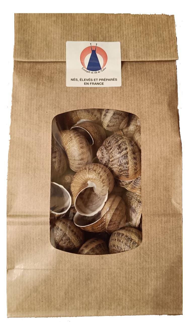 3 douzaines de coquilles d'escargots vides présentées dans un sac kraft. A accommoder selon vos envie, avec des escargots et un beurre persillé dont votre famille à le secret ou bien une farce végétarienne afin de combler tous vos convives.