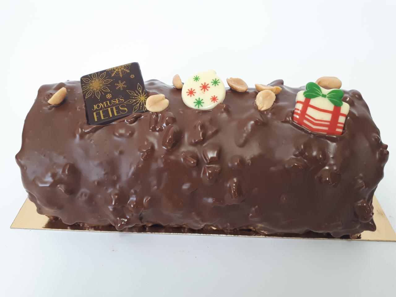 Bûche glacée enrobée de chocolat avec à l'intérieur, croustillant noisette choco, glace Vanille, cacahuètes et caramel beurre salé.