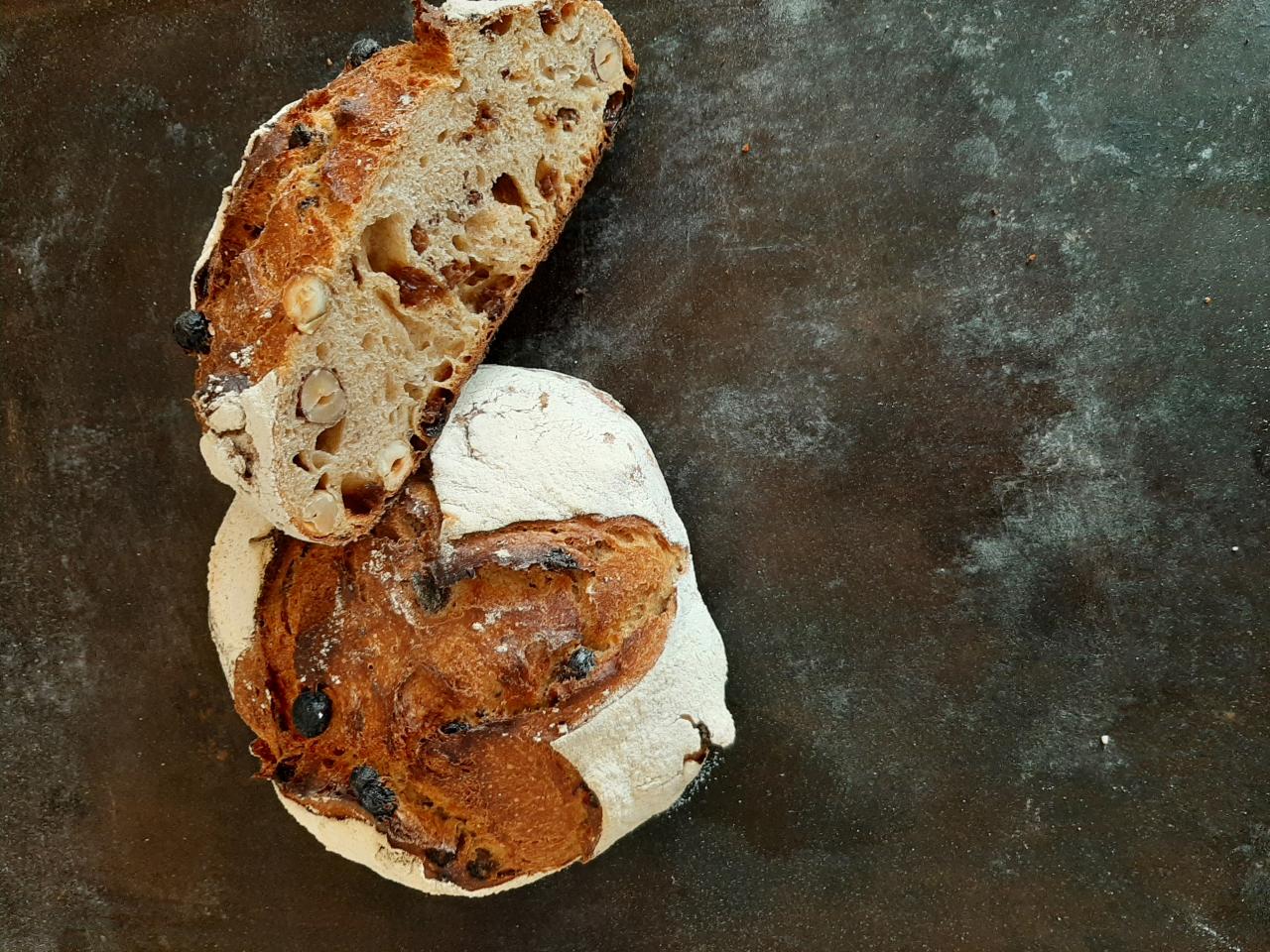 Pain de campagne aux raisins et aux noisettes toastées. Comme tous nos pains il est pur levain naturel, pétri à la main, et en fermentation longue.