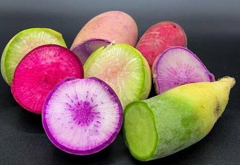 les Radis Meat mélangés (Red/Pink et Blue) : La chair juteuse et savoureuse de couleur rose a une saveur assez douce mêlant celle du radis noir et de la pastèque (à déguster cru : en toasts, en salade, en carpaccio, en poêlé, en soupe…)