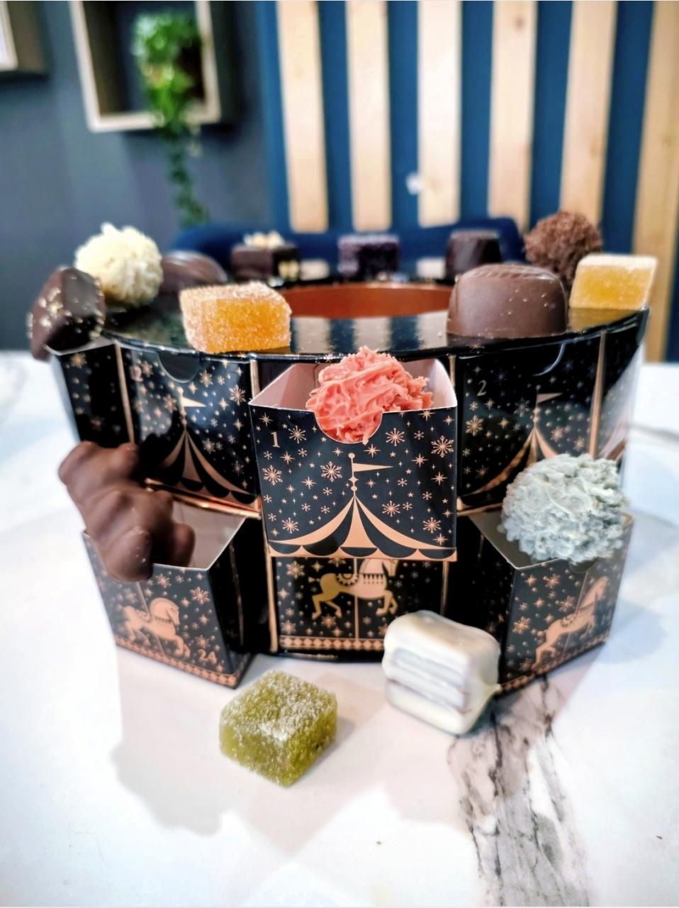Calendrier de l'avent en forme de carrousel, c'est notre Calendrier signature garni de toutes nos gourmandises maison: