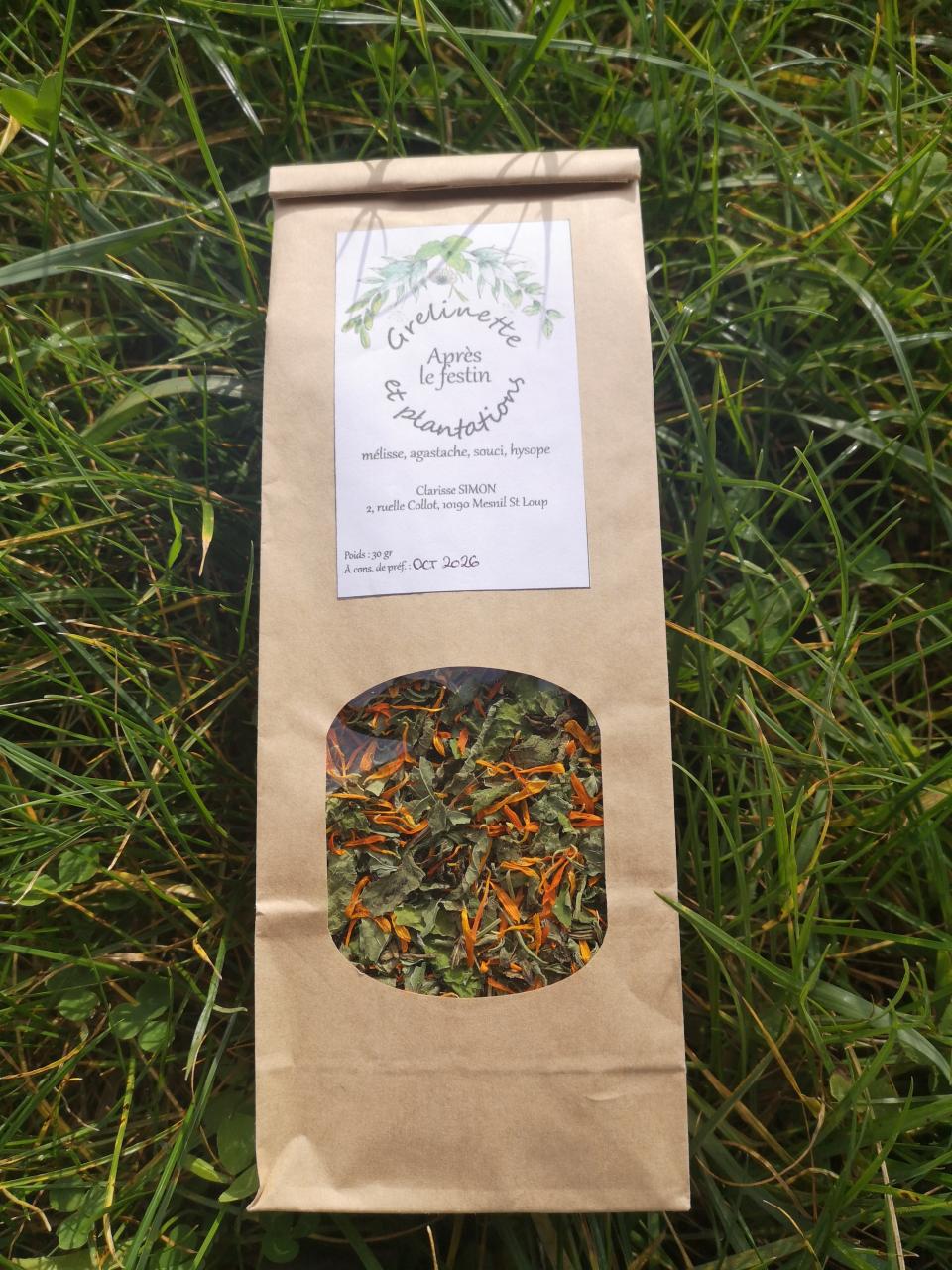 Conditionnement : Sachet kraft Durée de conservation : 1 ans Ingrédients : Feuilles de mélisse, fleurs de lavande et pétales de coquelicot. Origine : Mesnil St Loup, Aube