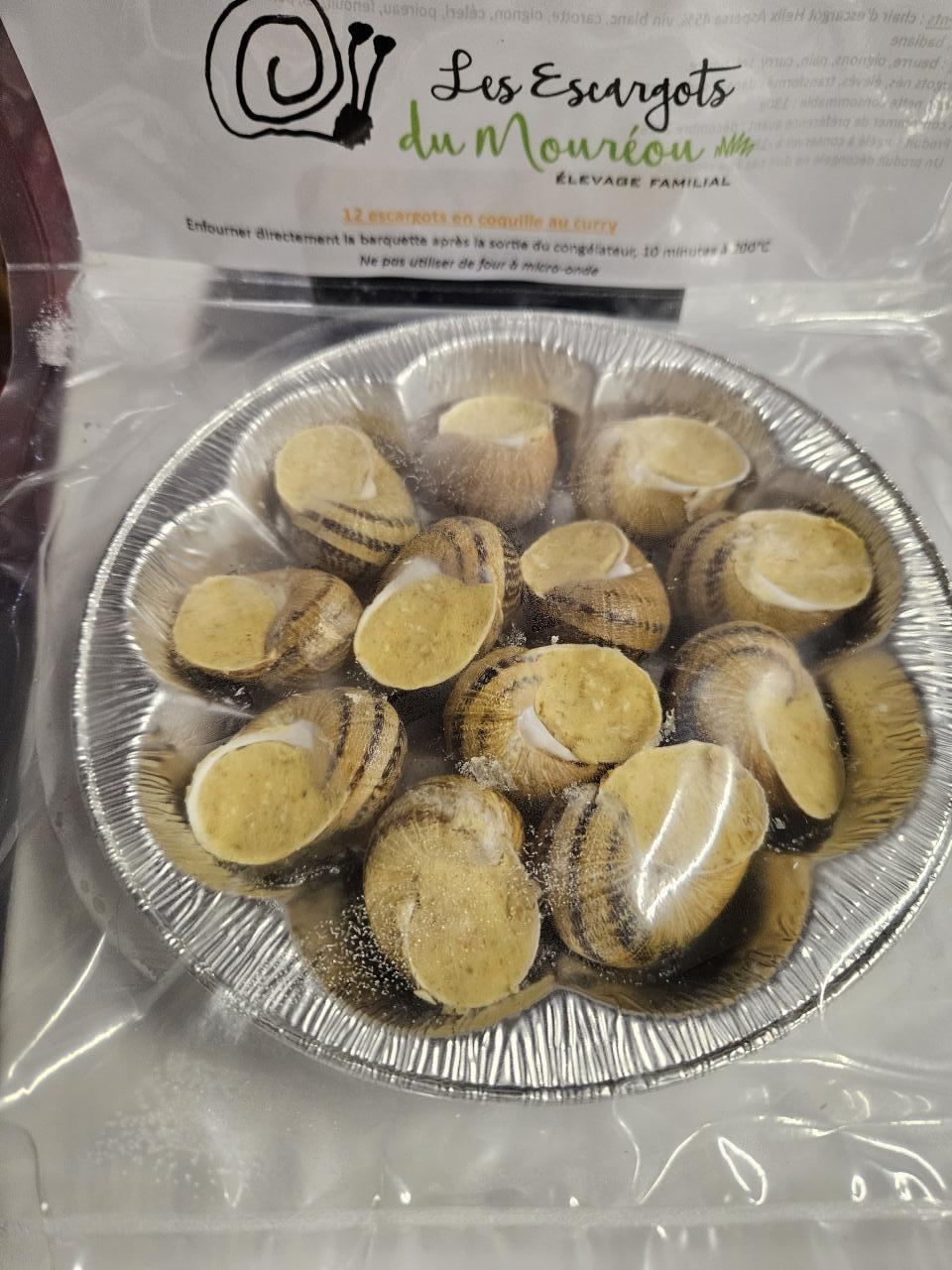 Assiette de 12 escargots en coquilles beurrés au Curry.