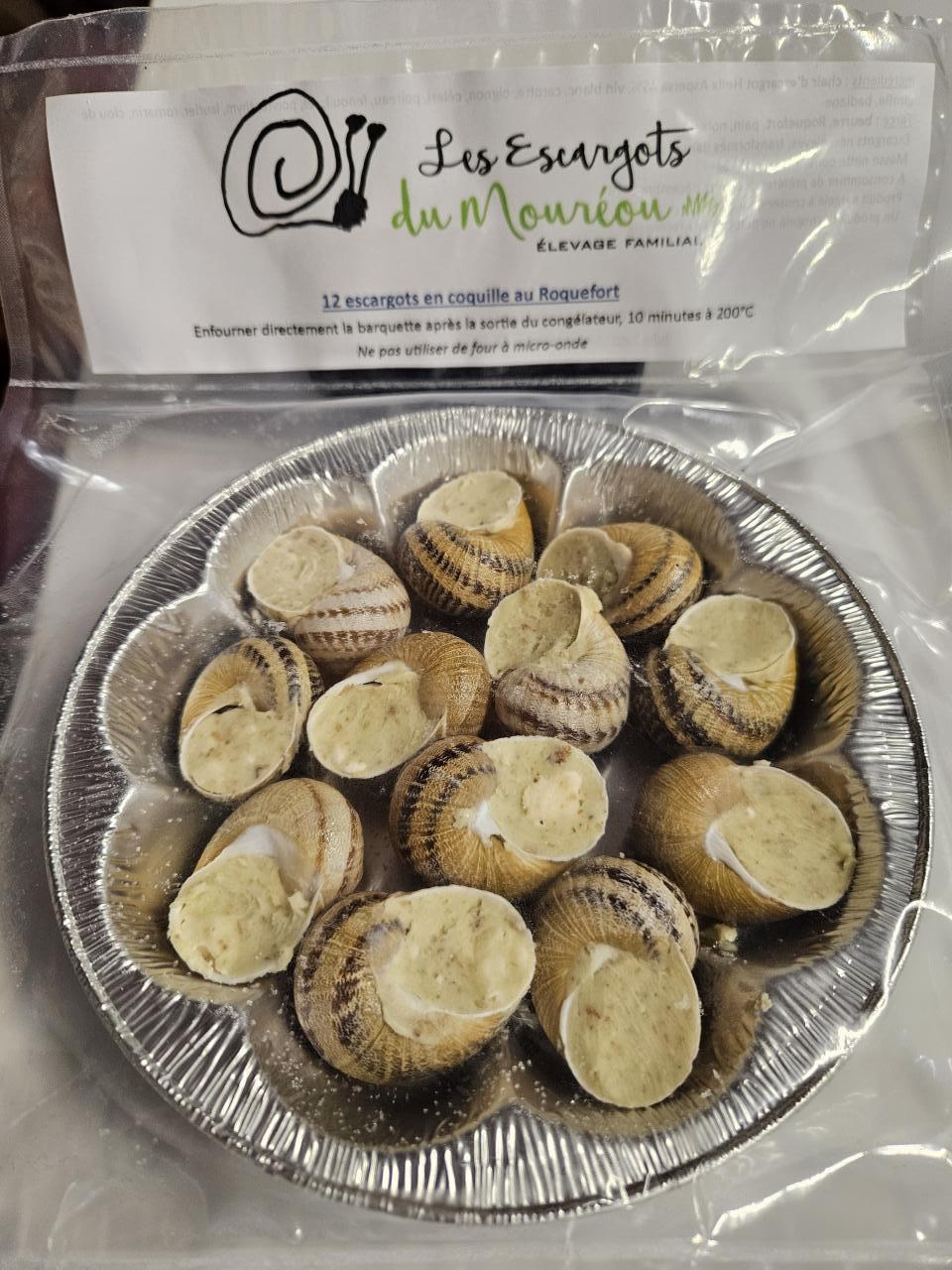 Assiette de 12 escargots en coquille beurrés au Roquefort et noix.