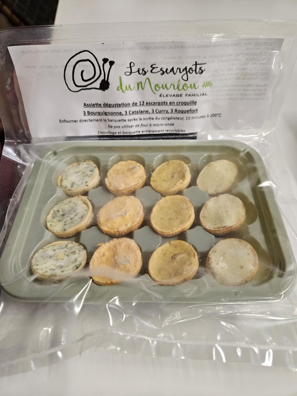 Assiette dégustation de 12 escargots en croquille. 3 beurrés à la Bourguignonne, 3 beurrés à la Catalane, 3 beurrés au Roquefort/noix et 3 beurrés au Curry.