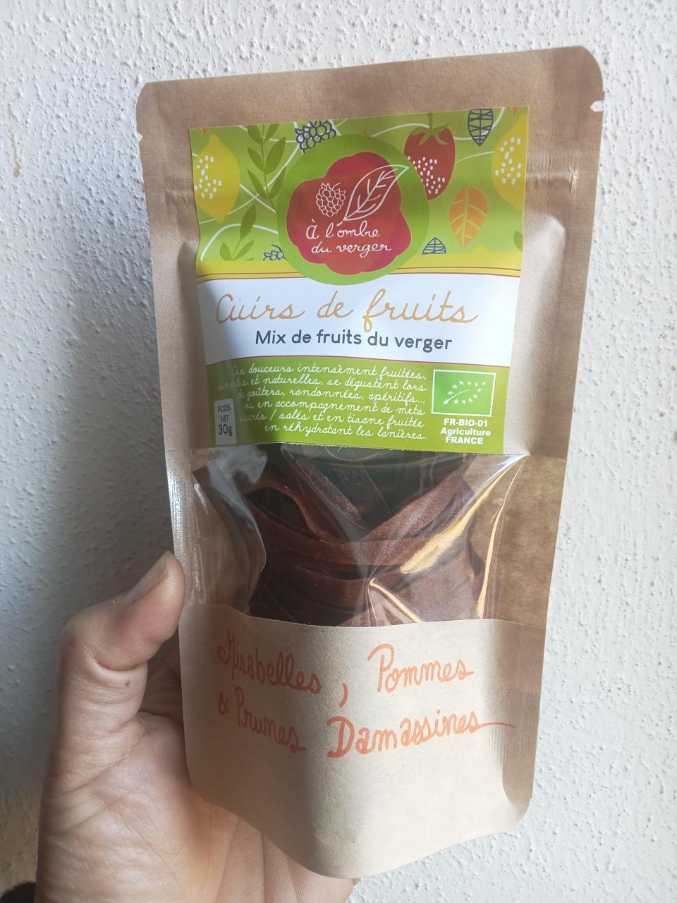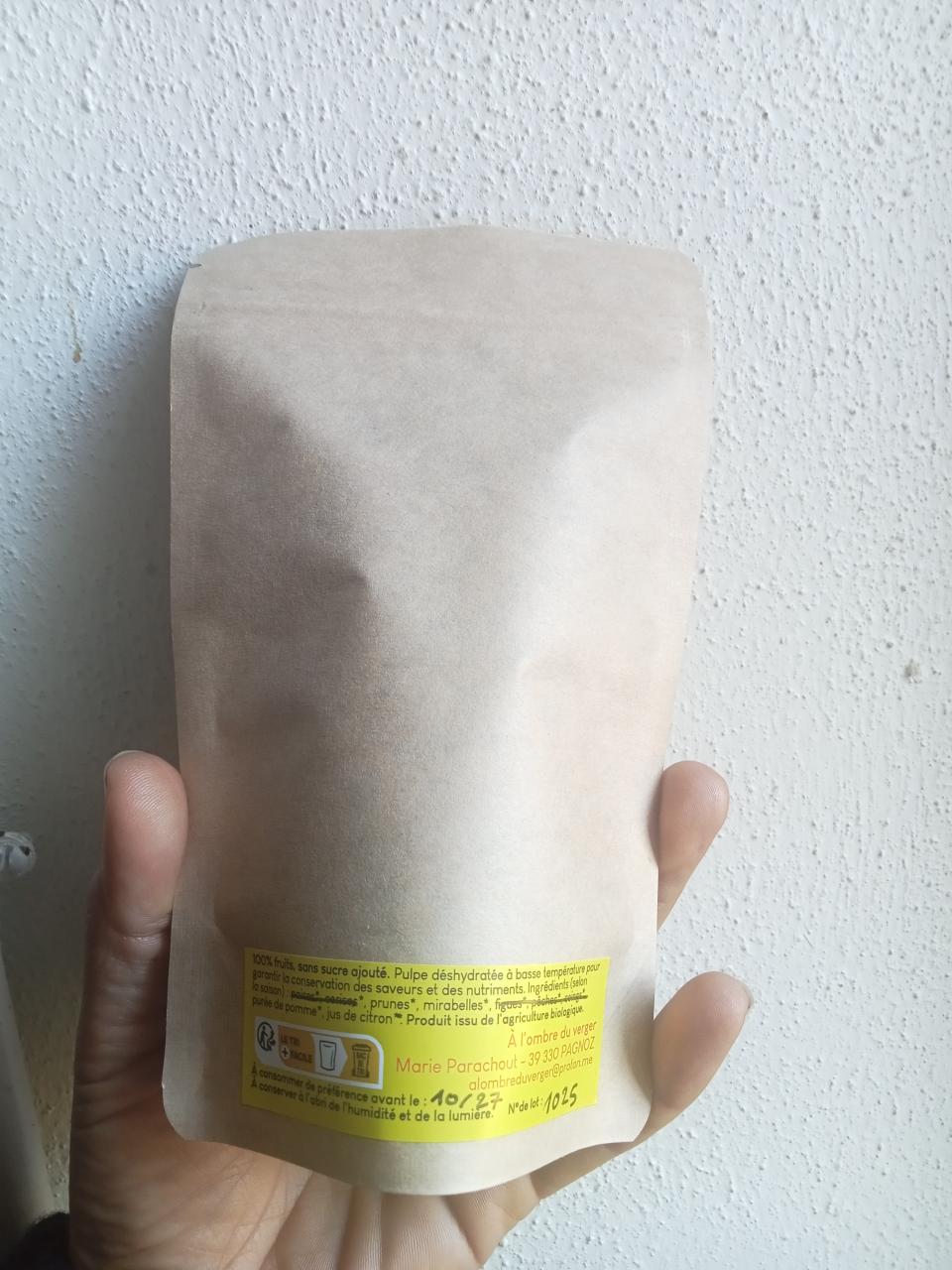 Conditionnement : sachets DOY Pack fraicheur avec ZIP et fenêtre Durée de conservation : ddm 10/27 Ingrédients : deux types de lanières de cuirs dans le sachet : Purée de Mirabelle et purée de pommes et zeste de citron, purée de prunes Damassines et purée de pommes et zeste de citron Origine : Franche Comte