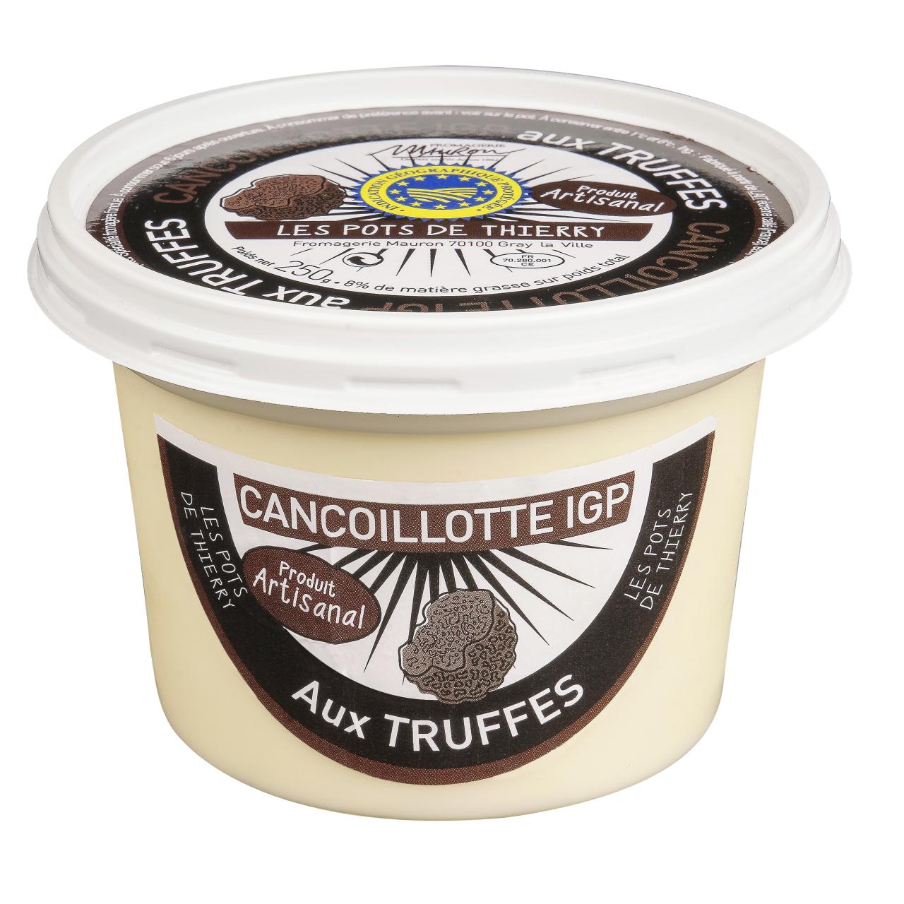 Allergènes : lait Durée de conservation : 21 Ingrédients : Lait écrémé caillé (France), eau, beurre Charentes-Poitou AOP, Truffes (Mélanosporum1%), sels de fonte (Citrate), sel de Guérande. Allergène : Lait Origine : Franche-Comté