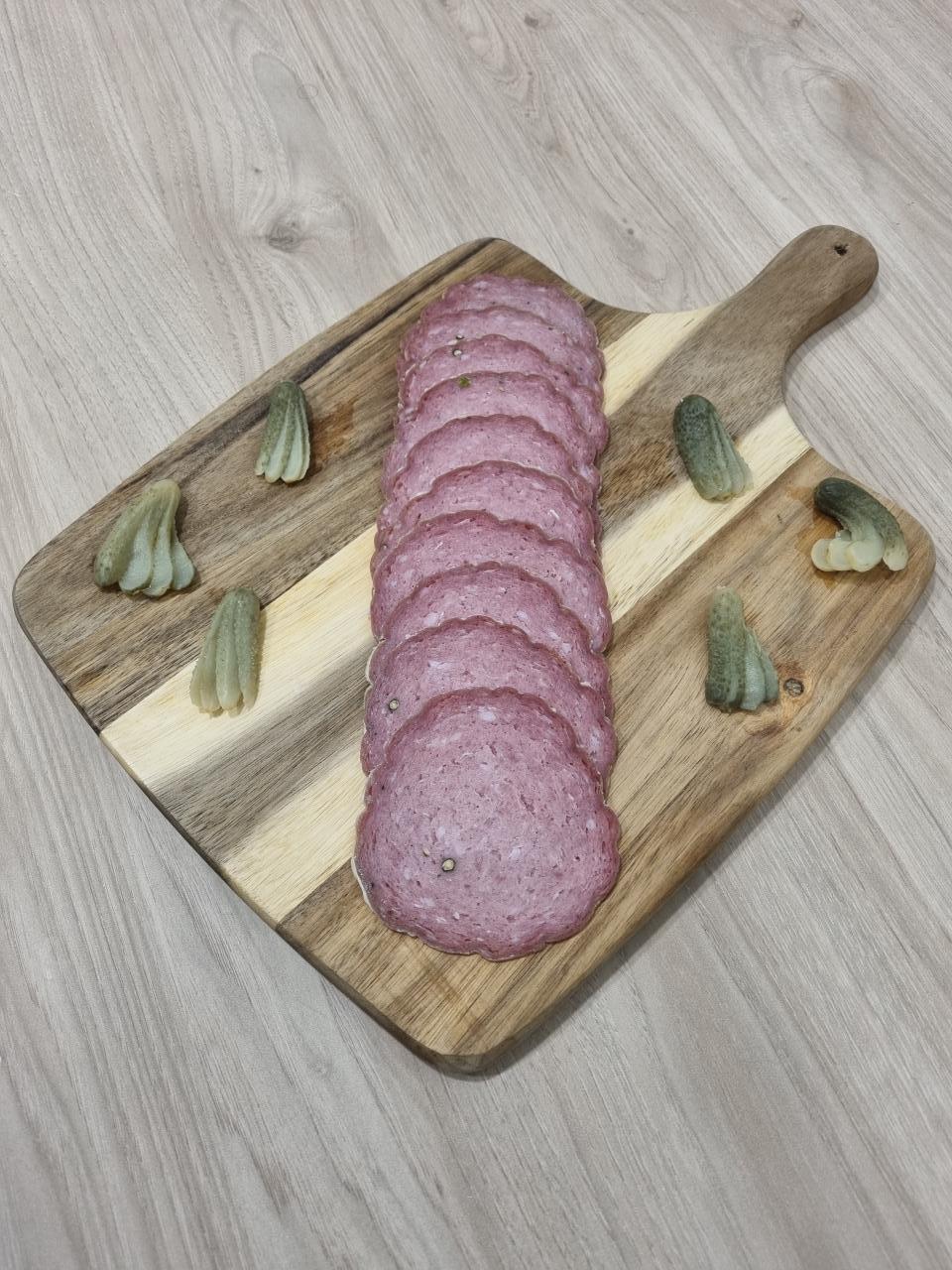 La Maison du Cochon vous propose de la charcuterie sous forme de salami tranché.
