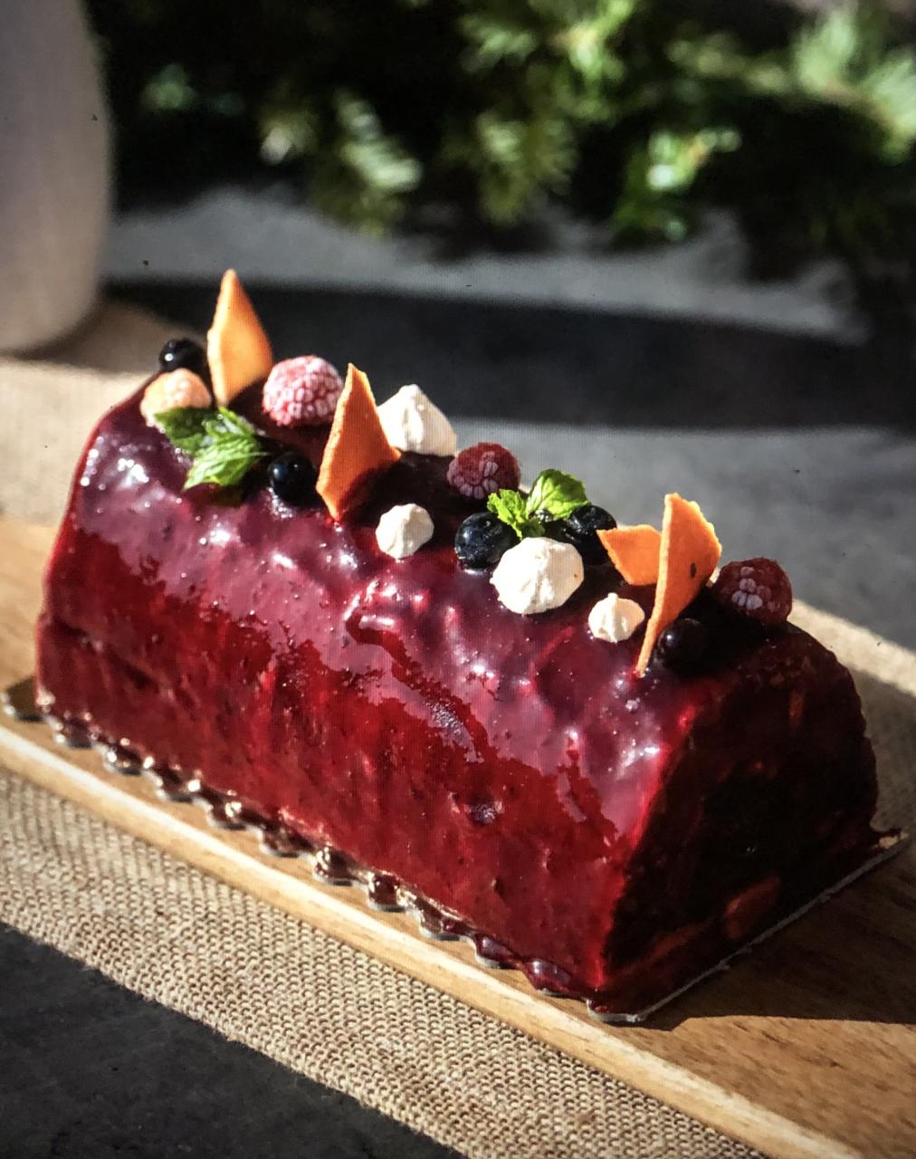 Sorbet menthe citronnée - Sorbet fruits rouges - Insert meringue - Nappage cassis.