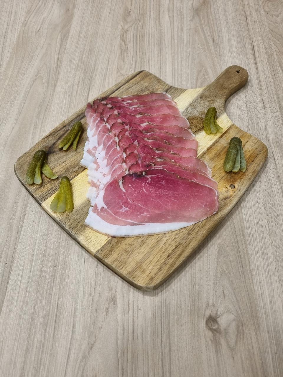 La Maison du Cochon vous propose de la charcuterie sous forme de noix de jambon séchée puis tranchée.