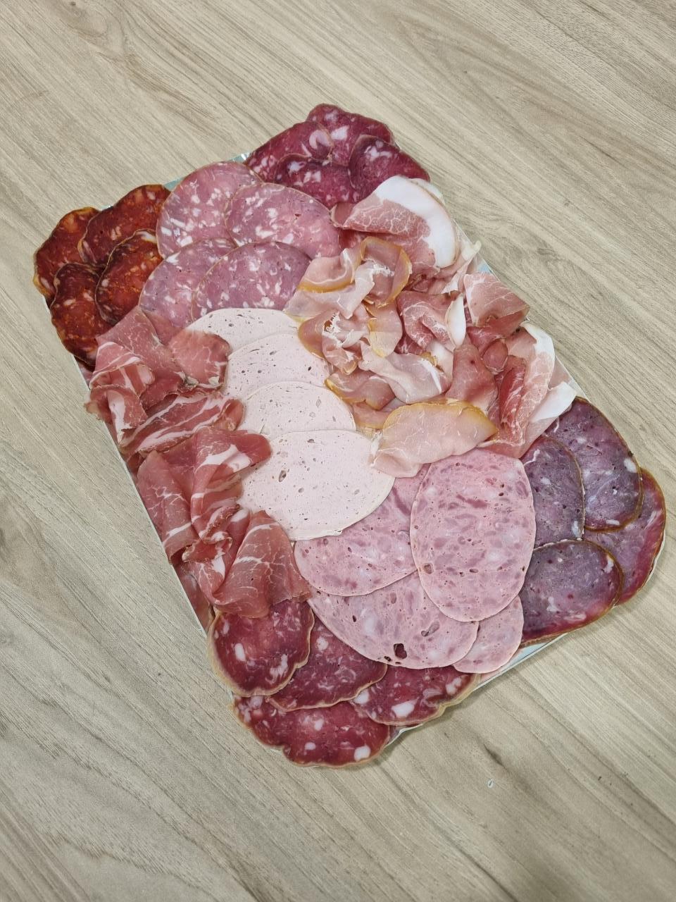 La Maison du Cochon vous propose un plateau composé de 10 charcuteries différentes prêtes à être picorées en chiffonnade et en petite tranche : jambon sec, bacon, coppa, saucisson sec, saucisson sec fumé, chorizo, fuseau lorrain, fuseau lorrain fumé, cervelas, saucisson à l'ail.