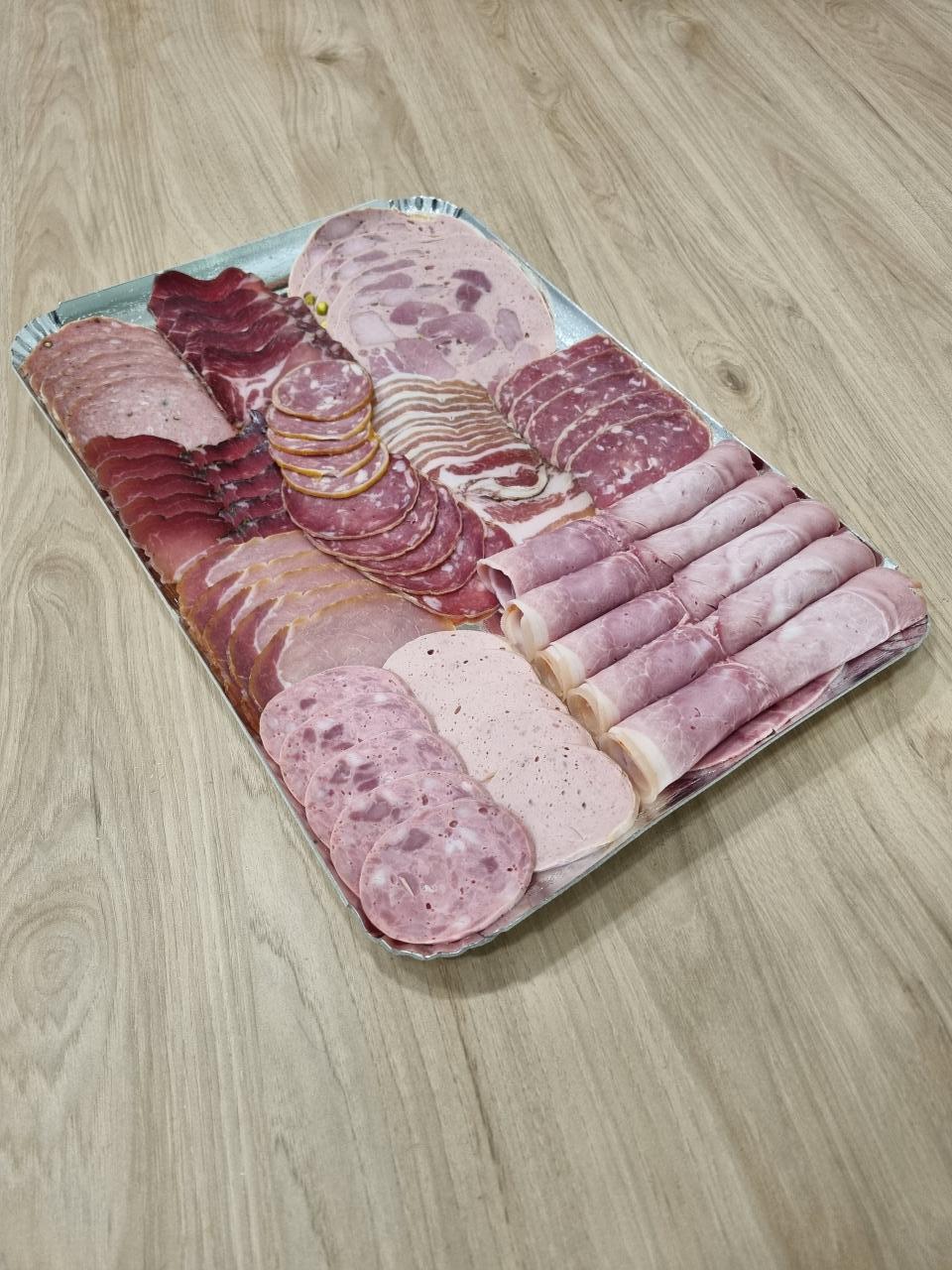 La Maison du Cochon vous propose un plateau composé de 12 charcuteries différentes : jambon blanc, jambon sec, coppa, bacon, fuseau lorrain fumé, cervelas, saucisson à l'ail, salami, rosette, pancetta, saucisse de jambon, mortadelle.