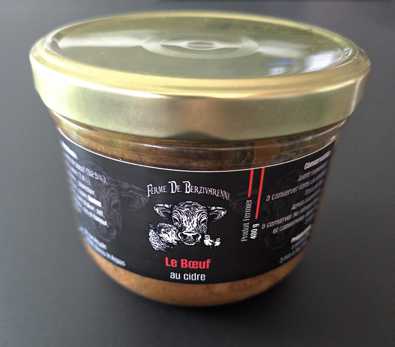 Ingrédients : Viande de boeuf (62,5%), eau, cidre (7,4%), oignons, pruneaux, abricot, raisin, farine, miel, huile d'olive, sel, cannelle, ras el hanout, poivre.
