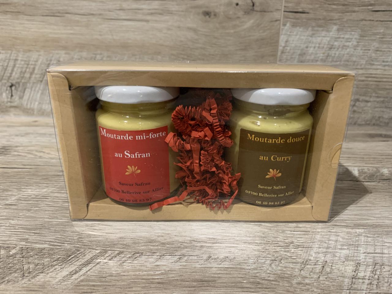 une moutarde douce aromatisée avec des pistils de safran et une deuxième moutarde aromatisé au curry. Elles sont idéales pour aromatiser des viandes ou pour préparer une vinaigrette originale.
