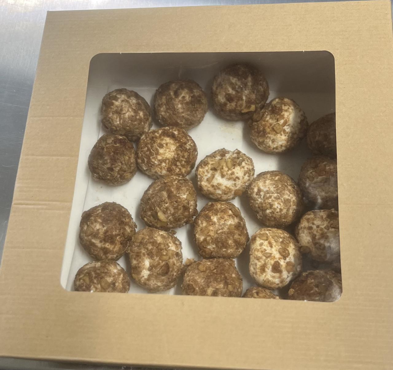 Allergènes : Gluten Conditionnement : 16 boules dans le boîte Durée de conservation : 10 jours Ingrédients : Fromage de chèvre au lait cru, épice de Noël (cannelle, muscade,…)