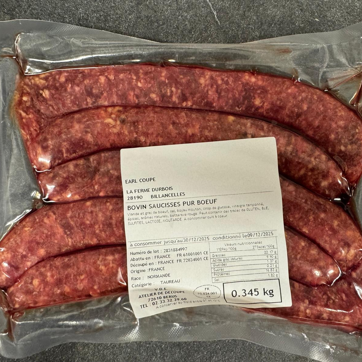 Un paquet de plusieurs saucisses issu de notre élevage de boeufs fermiers plein air de race normande à la FERME DURBOIS pendant plus de quatre ans.