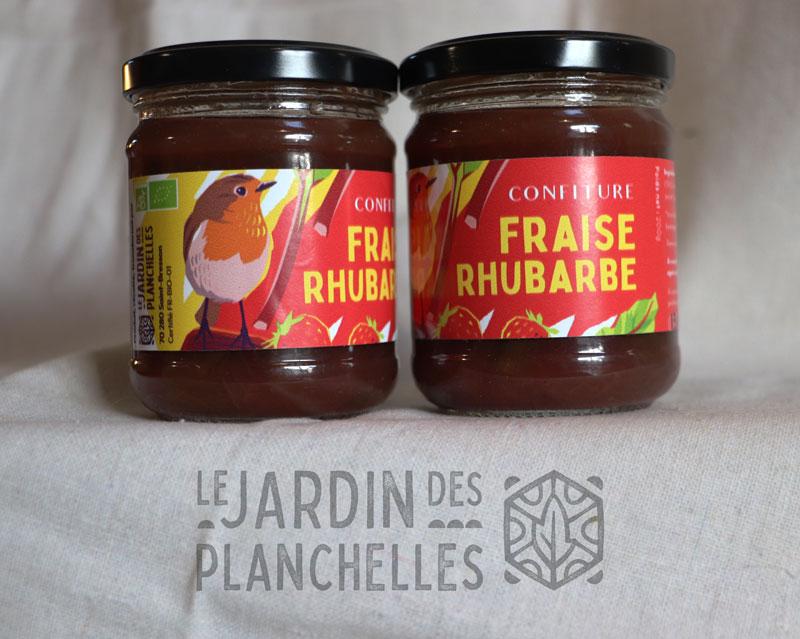 Conditionnement : pot en verre Ingrédients : Fraises(30%), rhubarbe(30%), sucre de betterave, agar-agar