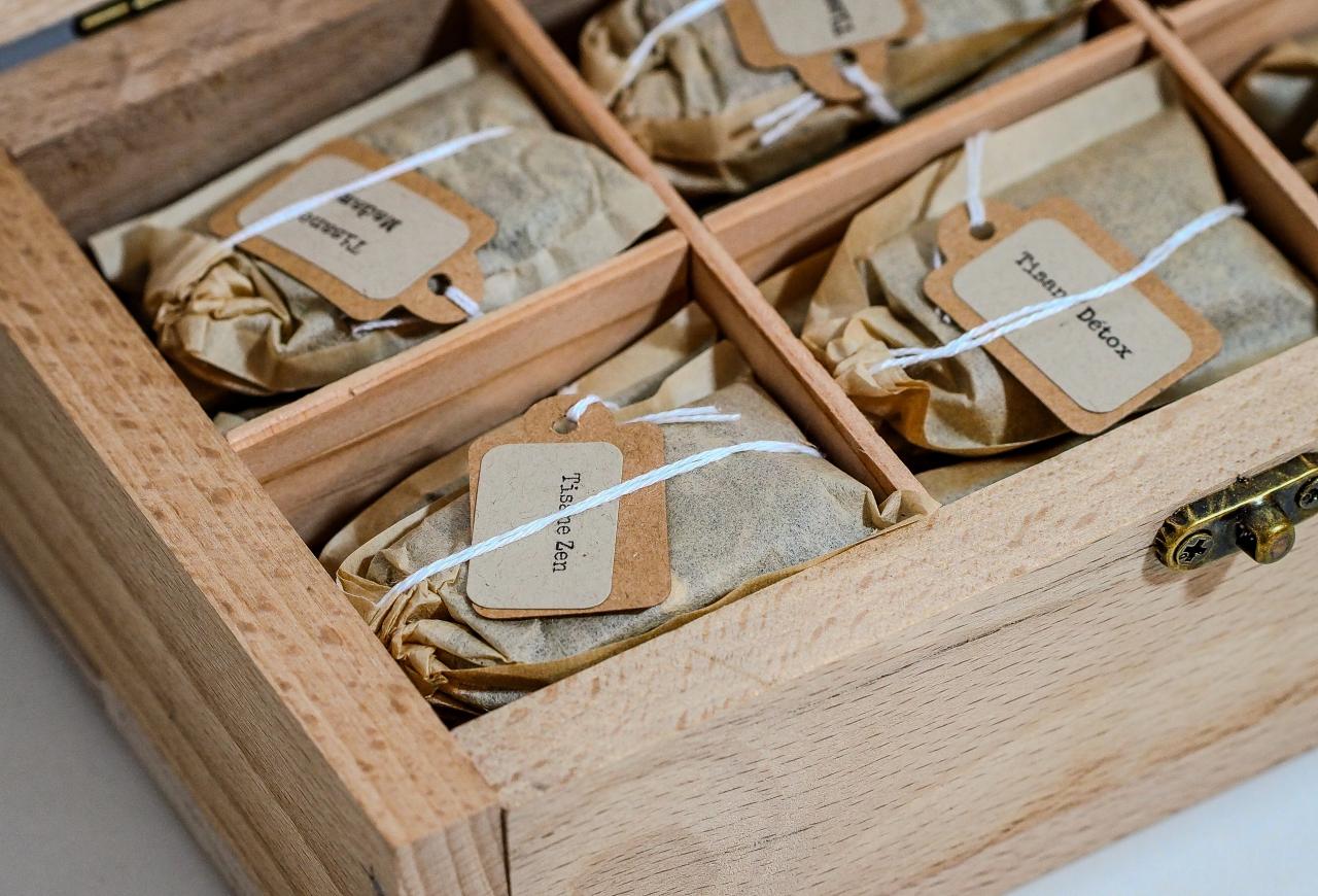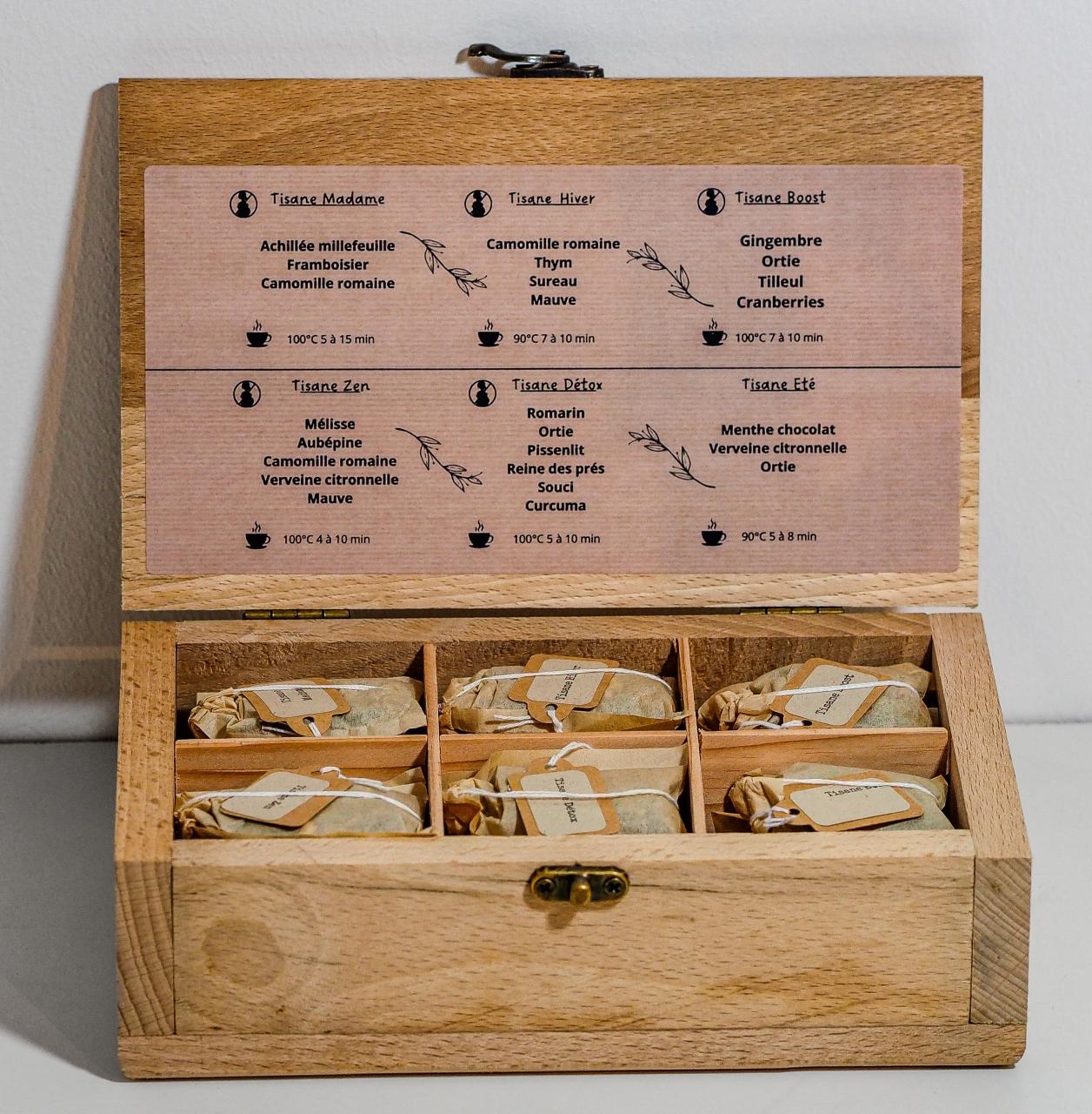 Coffret en bois brut, fabrication artisanale par l'atelier thérapeutique Sittelle à Langres, comprenant 24 infusettes et 6 sortes de composition d'infusion . Confectionnées à la main dans un sachet en fibre de bambou, réutilisable 1 fois lors d'une seconde infusion avec le même sachet et biodégradable.