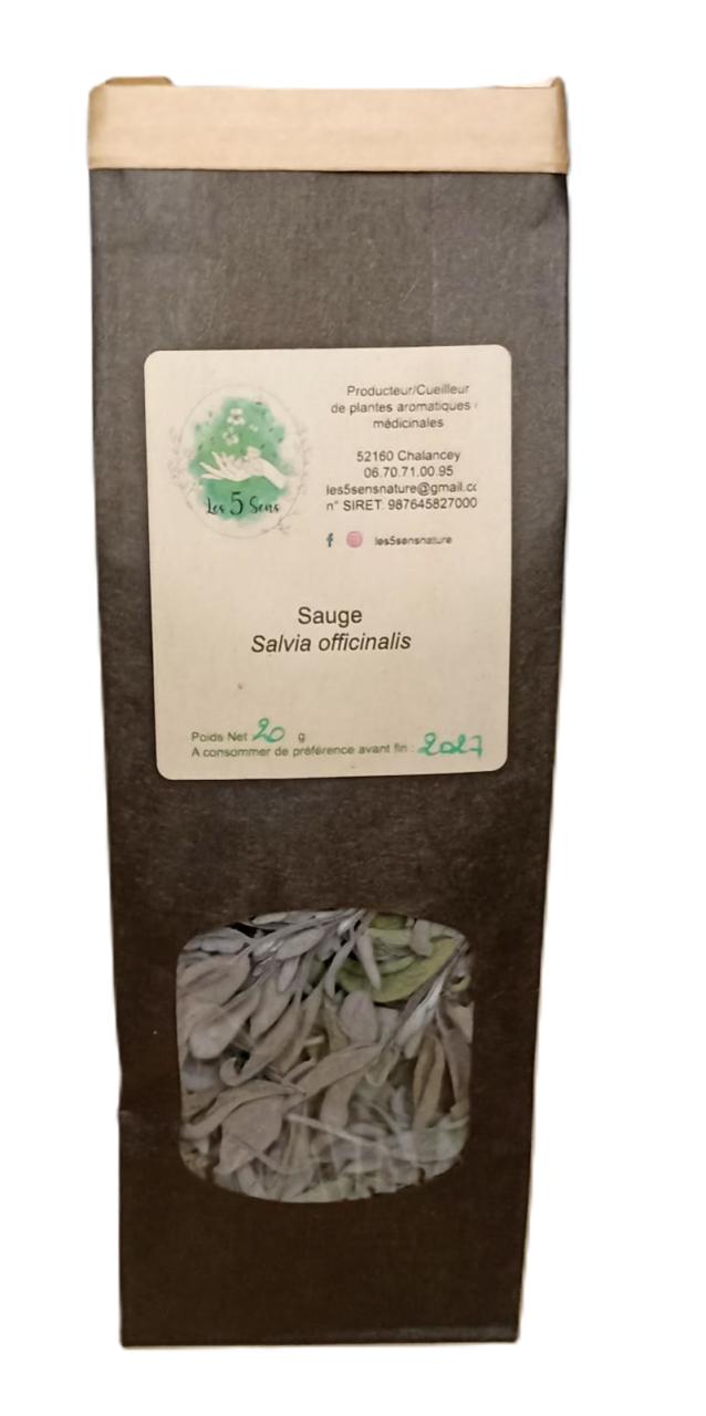 En infusion : La sauge est utilisée pour soulager les affections respiratoires, les troubles digestifs, les inflammations de la peau, les maux de gorge et les troubles hormonaux chez les femmes. 1 c à soupe dans 250 ml d'eau bouillante, non couvert 10 min. Saveur puissante, infuser moins longtemps si goût trop prononcé.