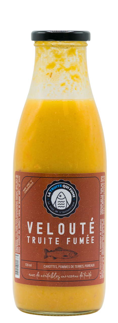 Ingrédients : Eau, truite 17,4% (oncorhynchus mykiss)* dont 50% de truite fumée, poireau 10,5%, pomme de terre 10,5%, carotte 8,7%, oignon, crème de Bresse AOP*, sel, poivre.
