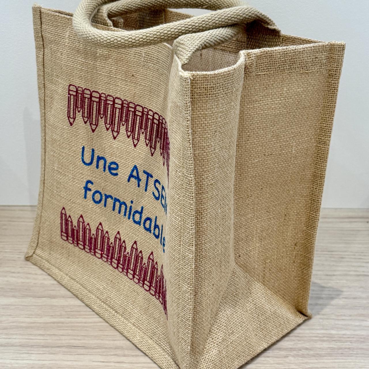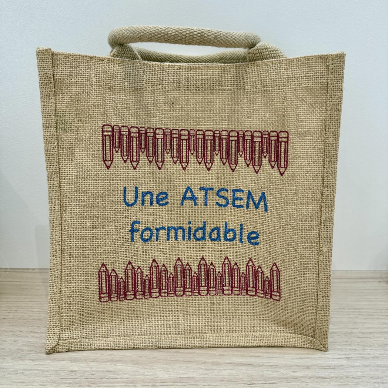 Flocage à paillettes framboise et turquoise « une ATSEM formidable »