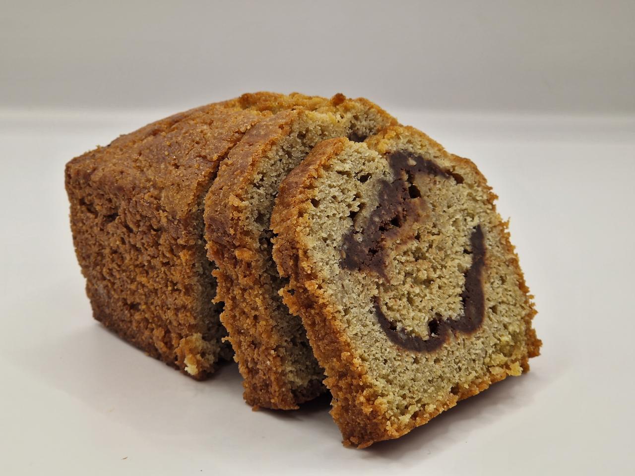 biscuit quatre-quarts élaboré avec un sucre complet qui lui donne un aspect grisâtre et permet d'abaisser la glycémie tout en apportant des saveur différentes, nous incorporons dans ce gâteau une pate à tartiner conçus pour qu'elle reste crémeuse à la cuisson ainsi cela permet d'apporté une touche moelleuse au biscuit avec des saveur de noisette.