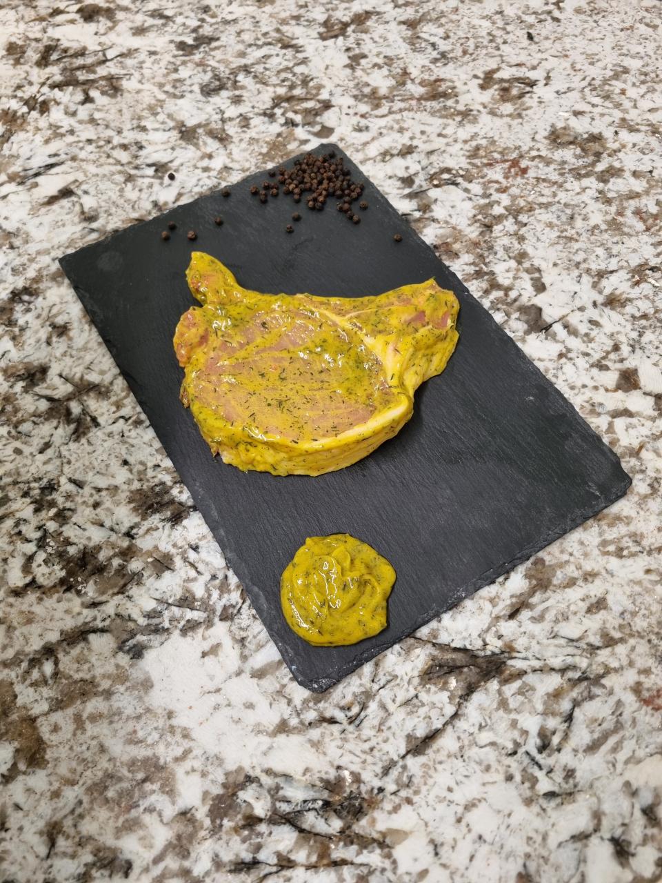 Ingrédients : Côte marinée thym-citron : Viande de porc de l'exploitation, graisse végétale (colza, beurre de cacao), huile de colza, sel, thym, citron, épices.