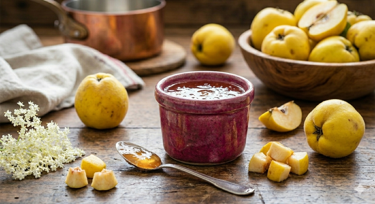 Le coing, reconnaissable à son parfum puissant et à sa chair ferme, développe à la cuisson des notes délicatement fruitées, légèrement acidulées et subtilement florales. Sa texture généreuse et fondante offre une belle profondeur en bouche, à la fois douce et pleine de caractère.
