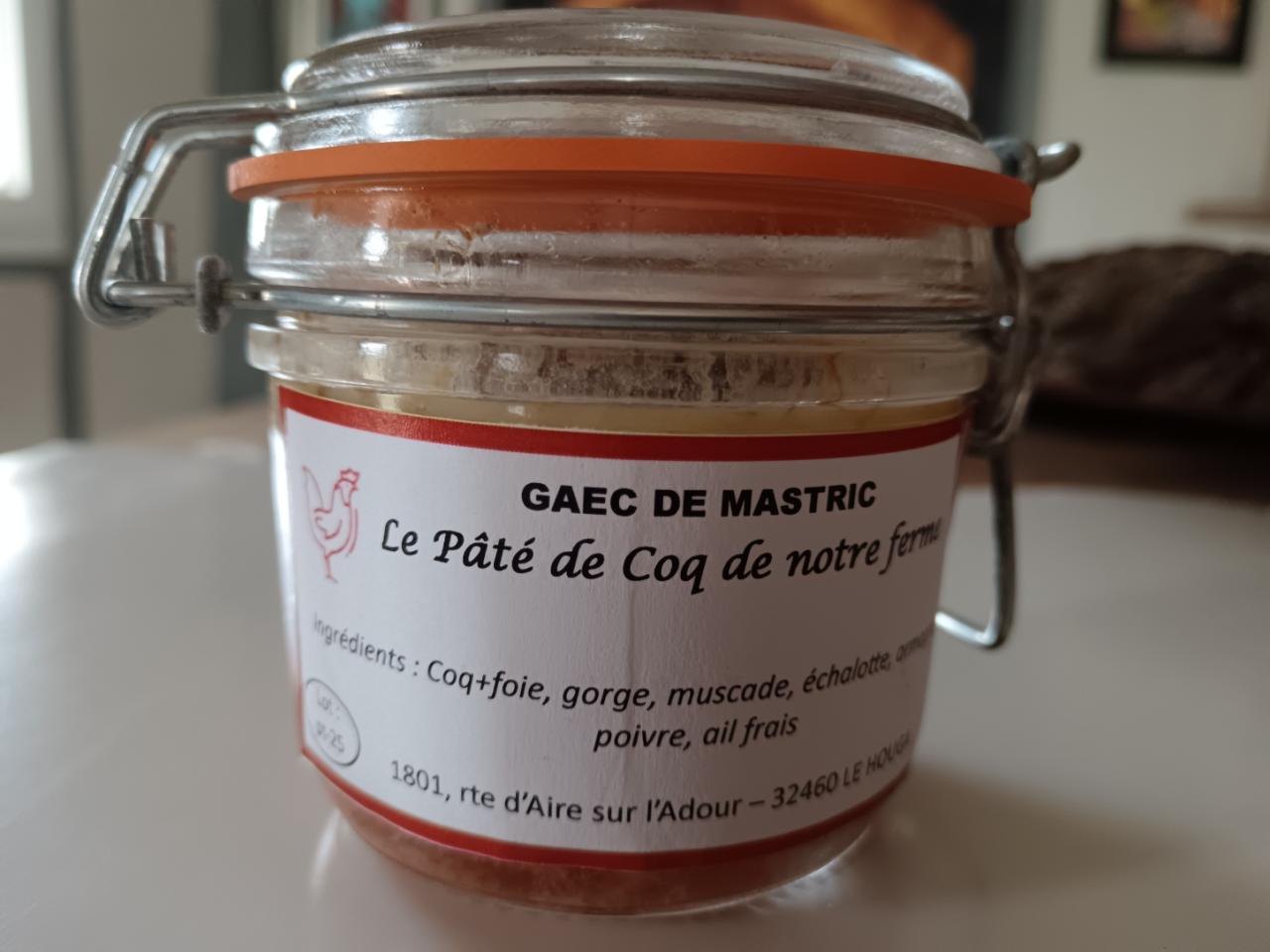 Bocal de pâté de coq de 190g - Ingrédients : viande de coq (volailles issues de notre ferme) + foie, gorge, muscade, échalotte, armagnac, sel, poivre, ail frais. Sans conservateur, sans colorant, sans sucre ajouté.