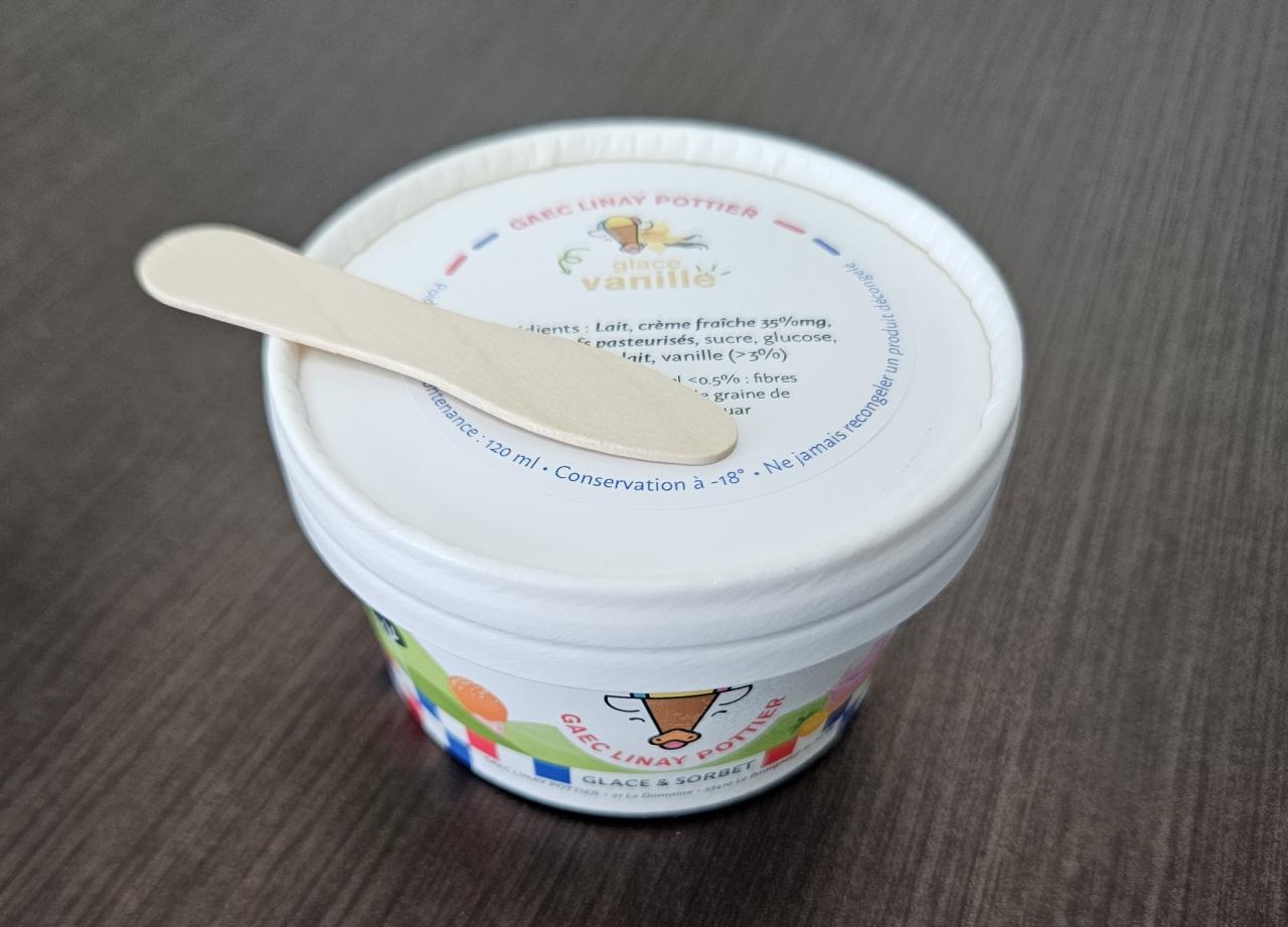 Ce pot correspond à une part adulte de 105 gr de Glace Vanille. Celui -ci contient une petite cuillère bois intégrée dans son couvercle!